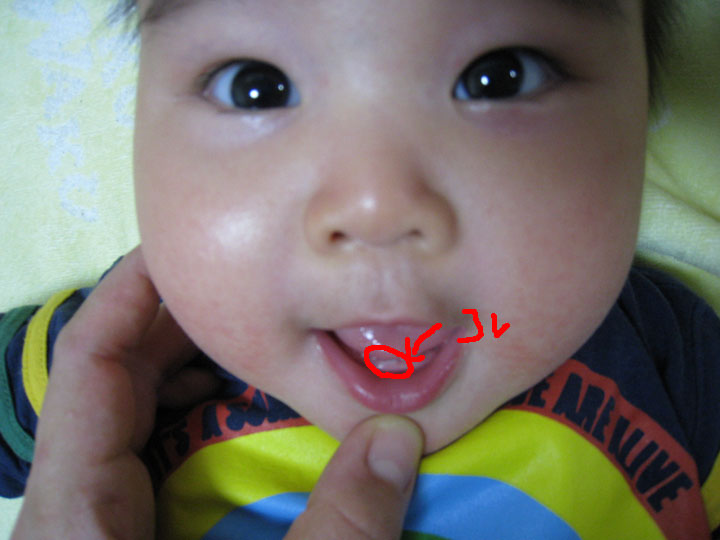 歯が生えたせいかな、痛いな、と思っていたんだけど、寝る前のパイのあと見てみたらほんのり赤くなっていて、その後お風呂に入って見たらまんまと血豆が。