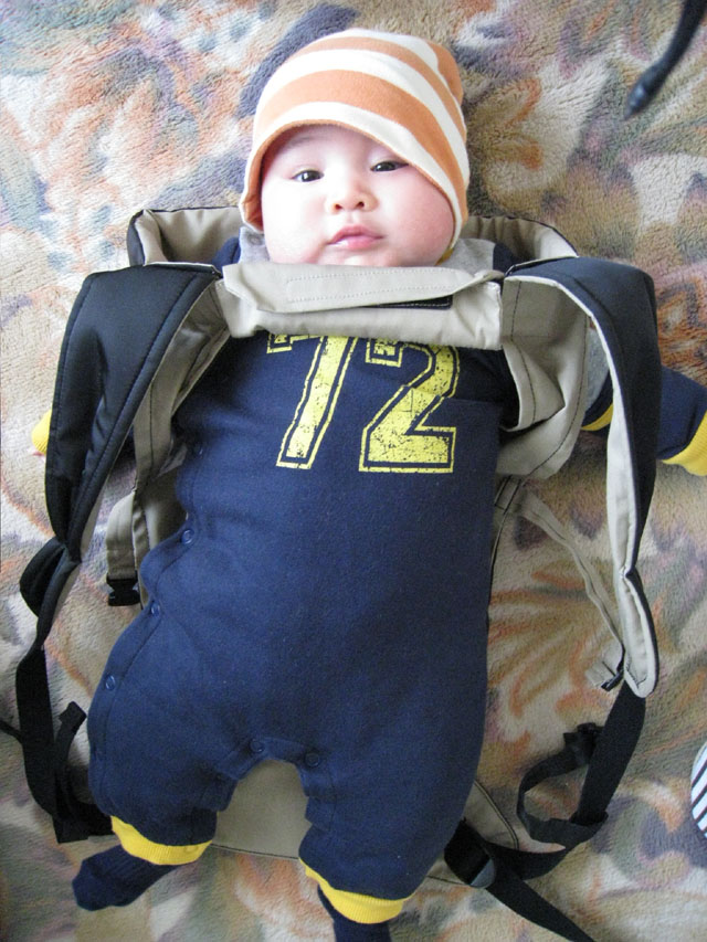 おかげさまで、息子はサイズ70のウェストがとうとうぱつんぱつんになりました(写真は抱っこひもを装着したところ)