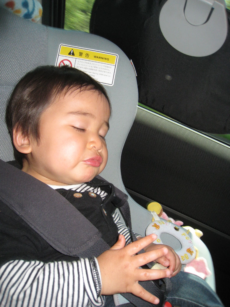 今回のワースト(というよりファニエスト)ピクチャ。帰りの高速で、オヤツを食べ終わる瞬間に眠りに落ちた息子。ちょうぶっさいくだわ(笑)