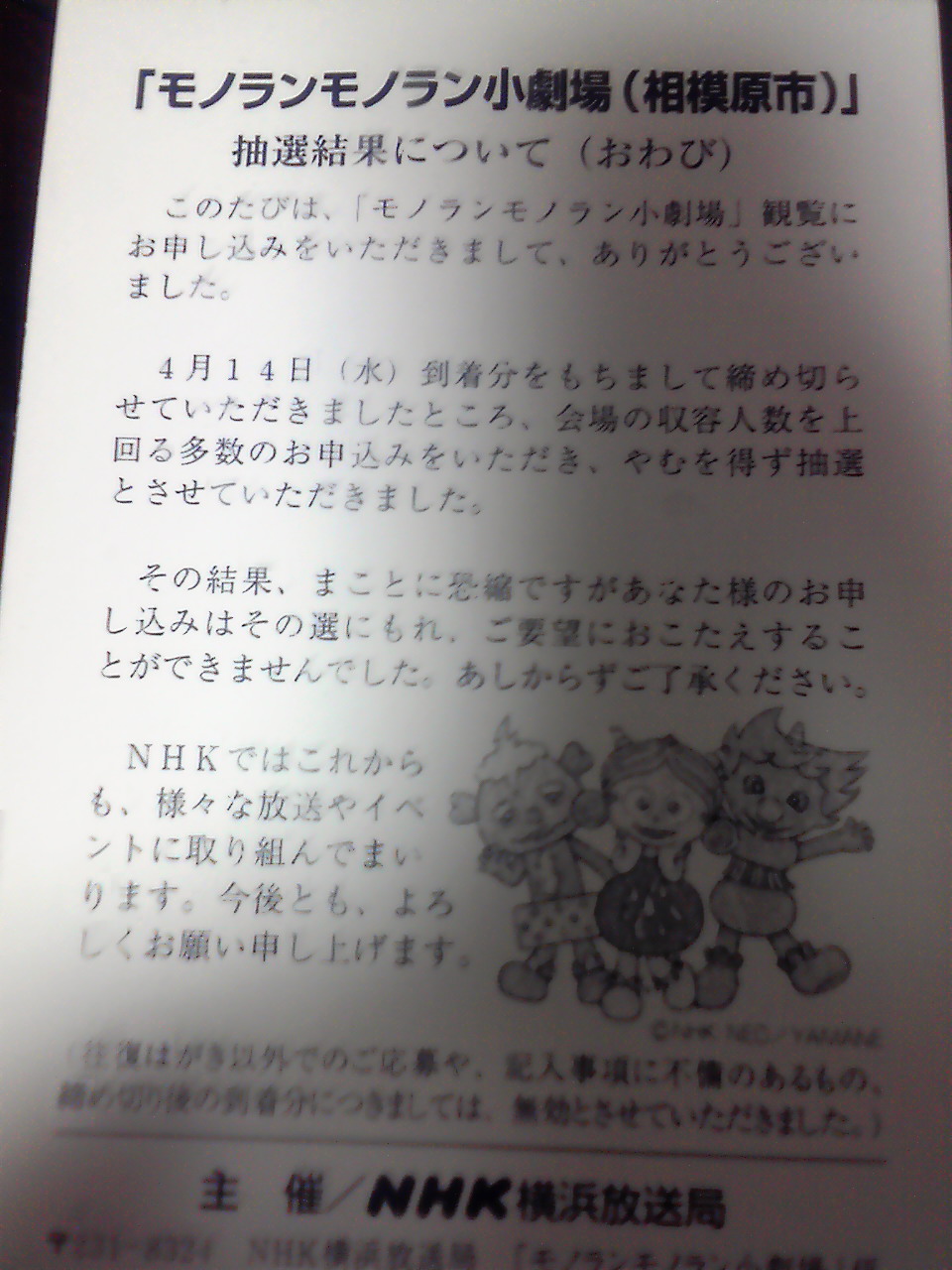 11:15 慌てて国立病院に駆け戻り、耳鼻科を受診しようと受付へ・・・・・って国立の午前受付『11時で終了』(ちなみにここの耳鼻科も超混雑で、小児科の先生も『ウチのは・・・ね』と苦笑いするくらいだったので、近所のにしようとおもった)