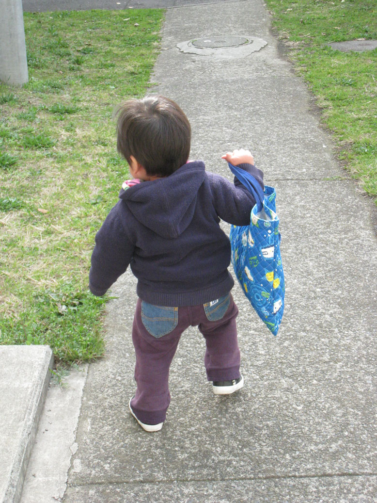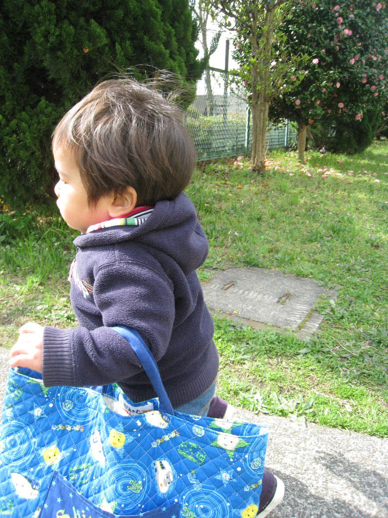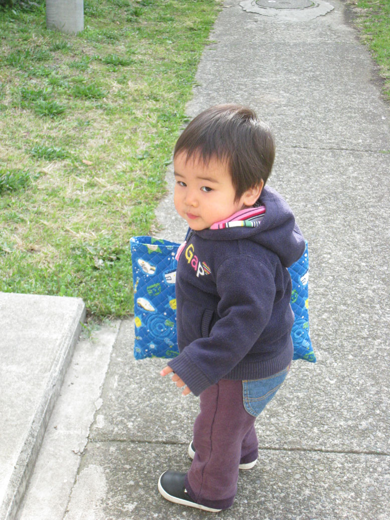 今朝、『あゆむね、バッグ自分で持って保育園行くんだよ』とオットに言ったところ、是非写真を撮ってこいと言われたので、何枚か撮りました。
