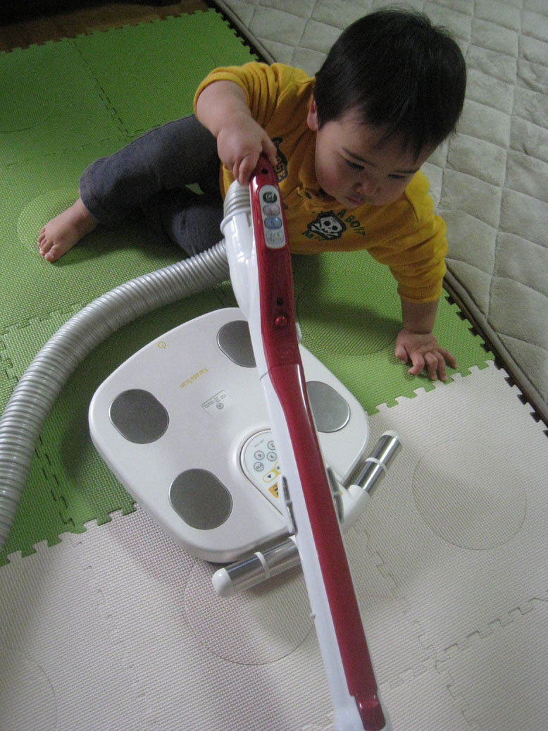いつも掃除機にべったりくっついてくる息子に、初めて掃除機を持たせてみたら上手にかけてました。あらビックリ。最近やりたがっていることを無理にやめさせたりすると、いきなりひっくり返って怒り出すので、こわいです。