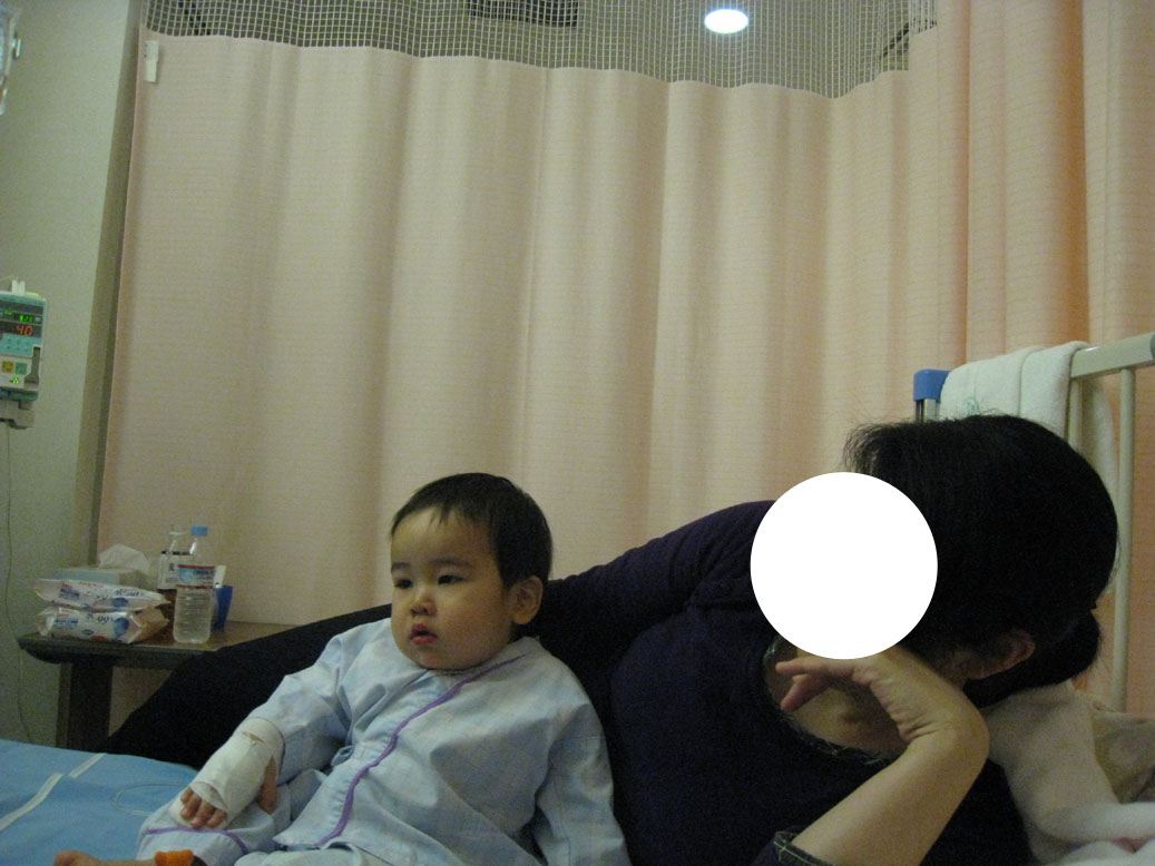 入院翌日(19日)。まだ調子が悪いのか、若干不機嫌そうな息子と、くつろぐ母ちゃん。