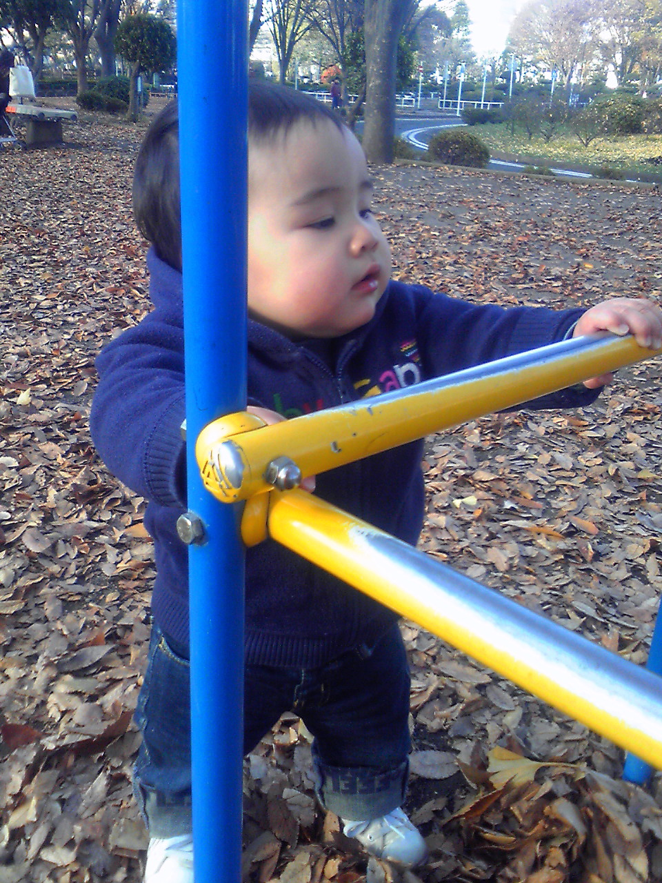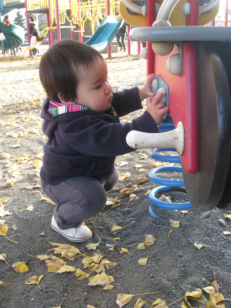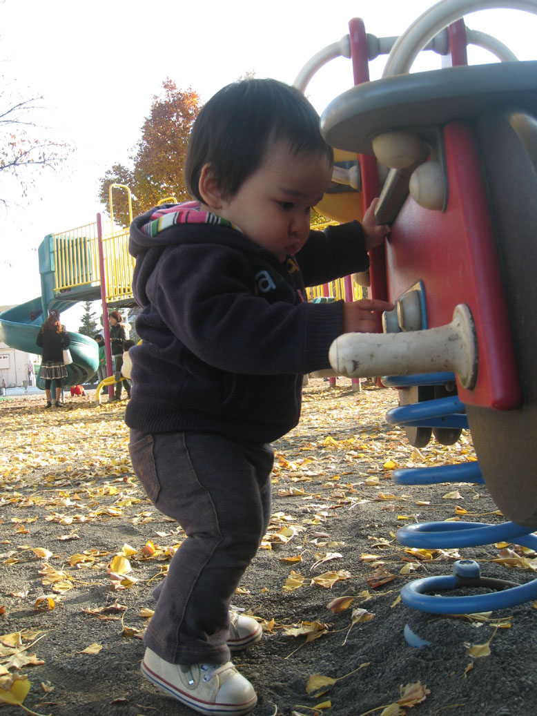 すべり台も行くけど、こういうユラユラ系の乗り物に近寄っては、じっくり観察してみたり、葉っぱや石をいじったり。