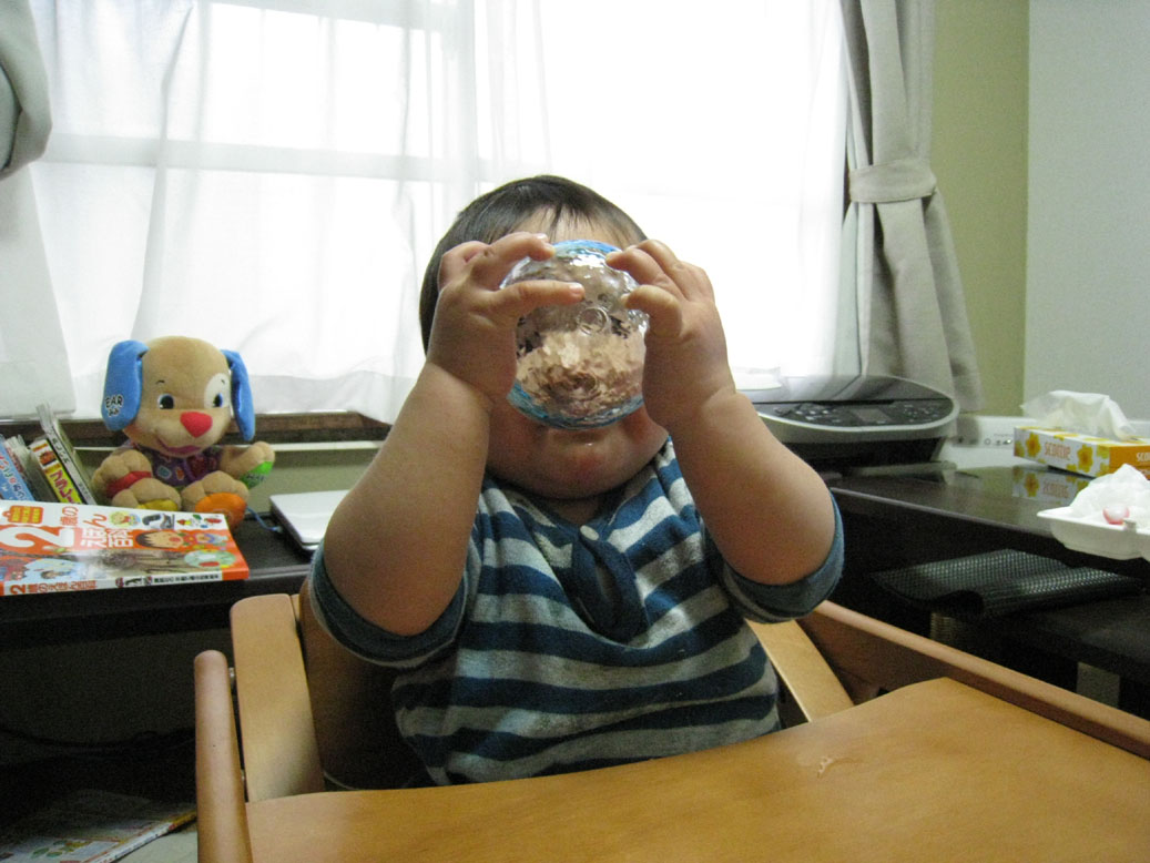 げほっ!となってもいいように、タオルを準備して恐る恐る渡したら・・・やっぱり一気だよコイツ!しかも『ぷはー』ていうから、飲み終わったのを見たら、コーン丸のみしてたよ!