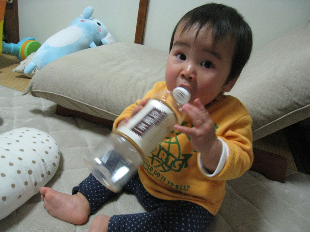 いつもはストローで飲んでいる風呂上りのフォローアップミルク、とうとうコップで飲ませろ!と言い出しました。