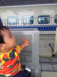 夕ご飯を食べ、いつものようにベランダで電車を見ていても、ぐずぐず・・・。あ~眠いのね~と思って急いでお風呂に入れました。