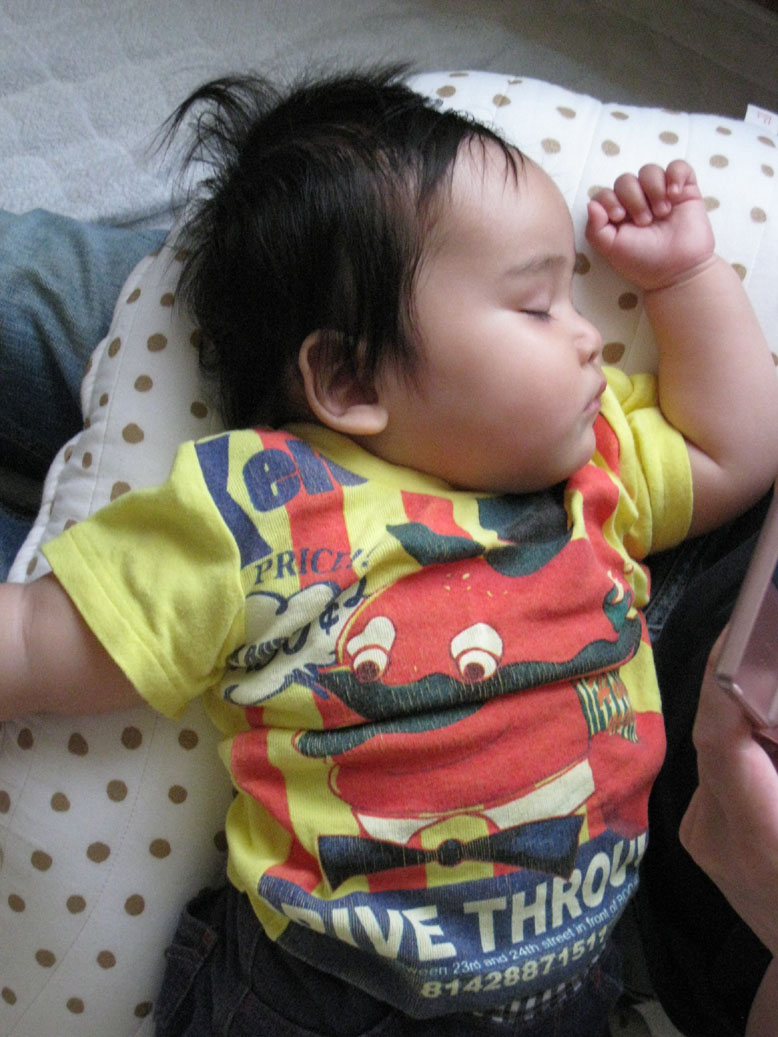 散髪前。母ちゃんの太ももで寝る息子。