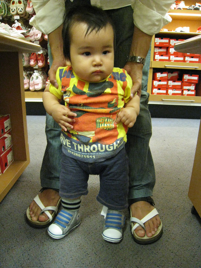 まだつたい歩きも数歩だけど、部屋で慣れるように、と思ってね。ちなみにサイズは11.8cmでした。あっという間に12cmになってしまうだろうなので、12.5cmあたりを狙って・・・