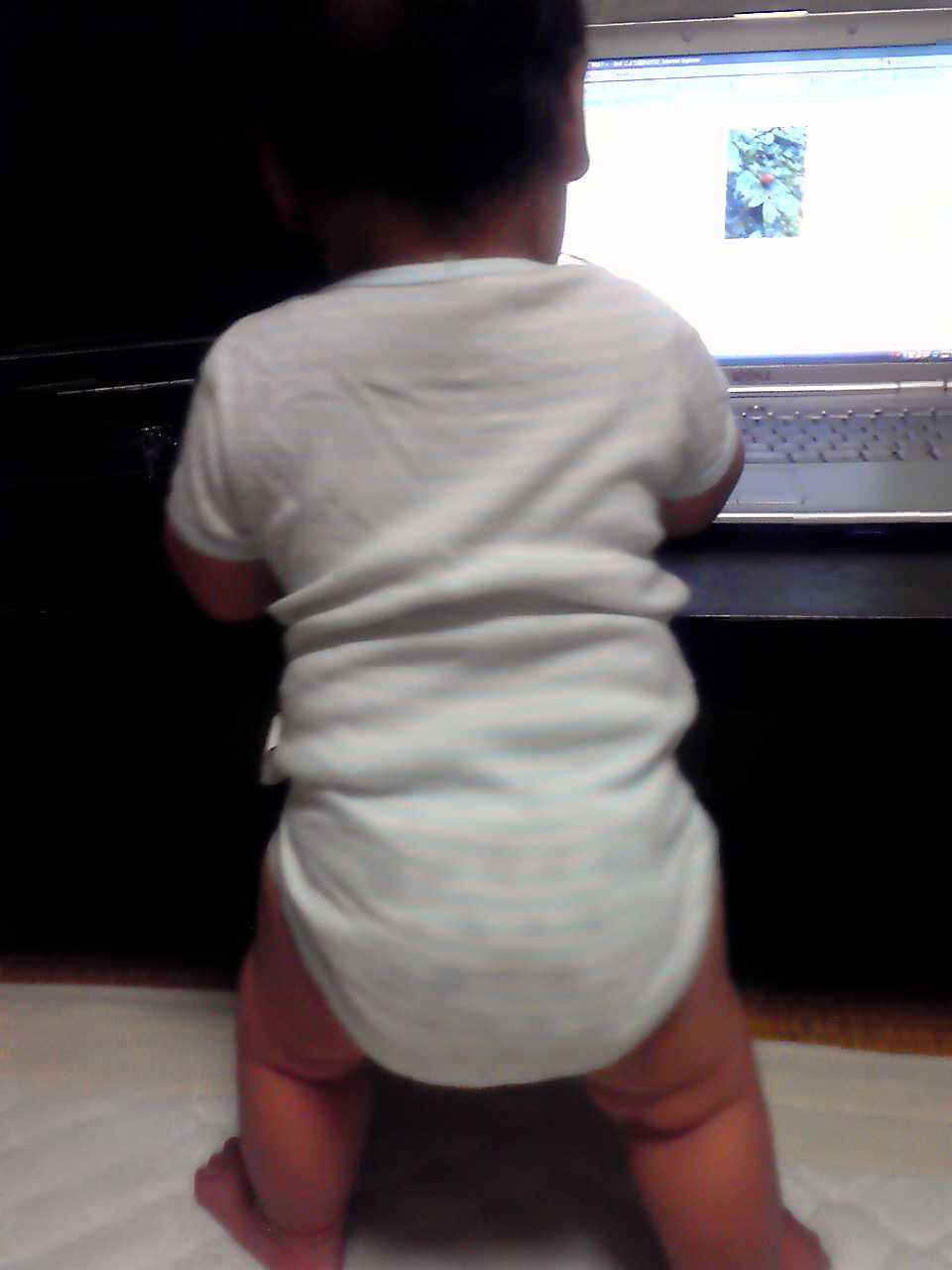 終わった後、これまたいつもどおりに私の太ももの上に立たせてた。だいたいこういう時、息子はパソコンに視線をうつすから、写真見せてあげたり、息子の好きなキャラクターを見せたりする。