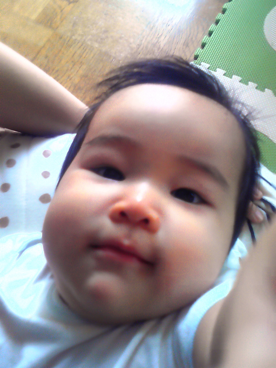 『あ~~』とか『う~~』とか、(´∀`*)ノシ バイバイとかは、それらしきものをバカ親の、超ひいき目に見て真似してる、という感じだったんだけども、最近よつんばいのハイハイの形を真似する。
